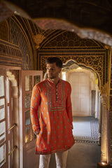 The ensemble features traditional motifs with elaborate embroidery, adorned with floral and geometric patterns across the bodice and skirt. The color palette is a mix of deep purples, oranges, and pinks, adding a festive yet elegant appeal.